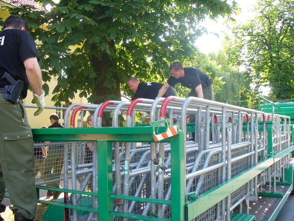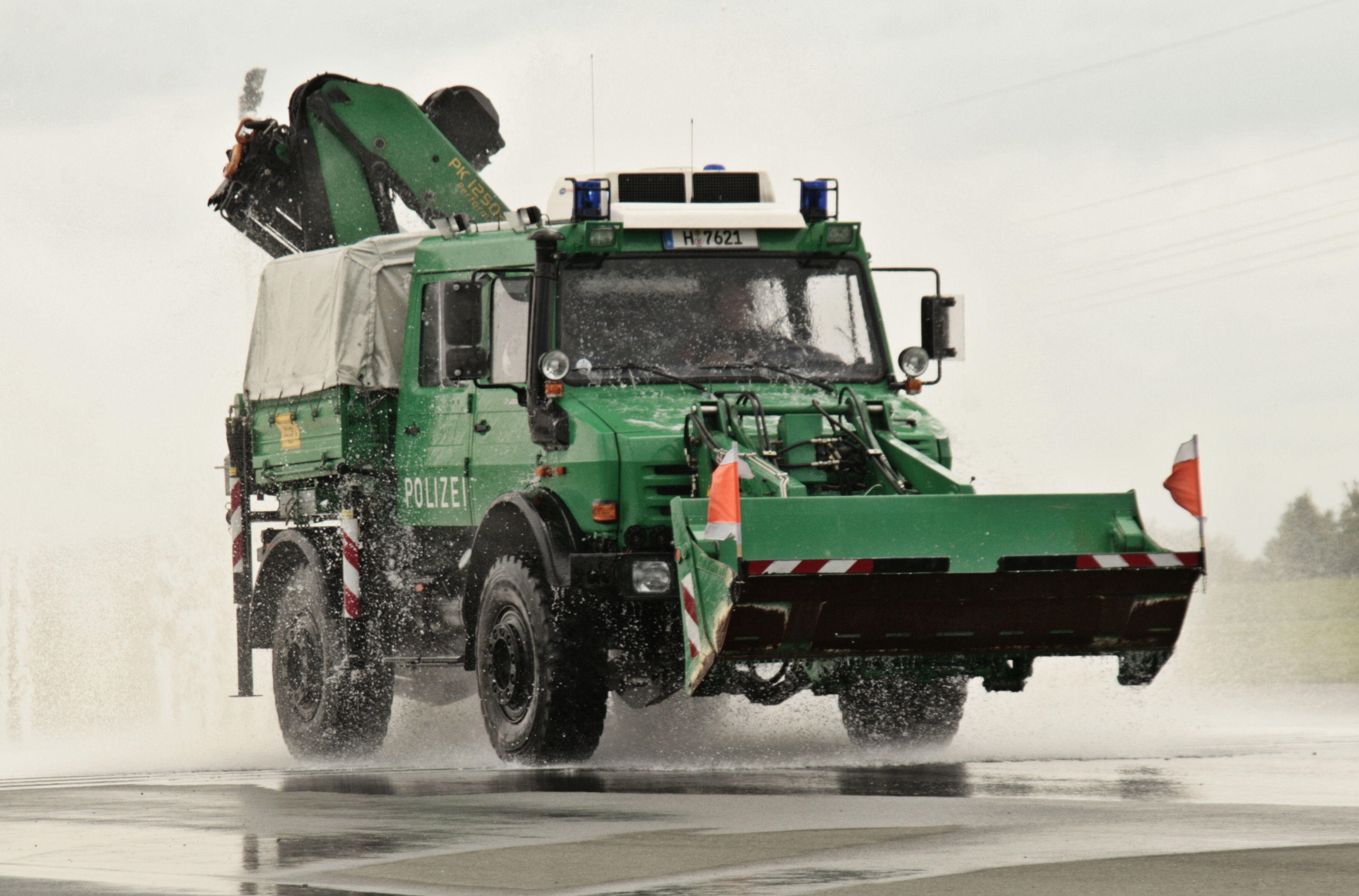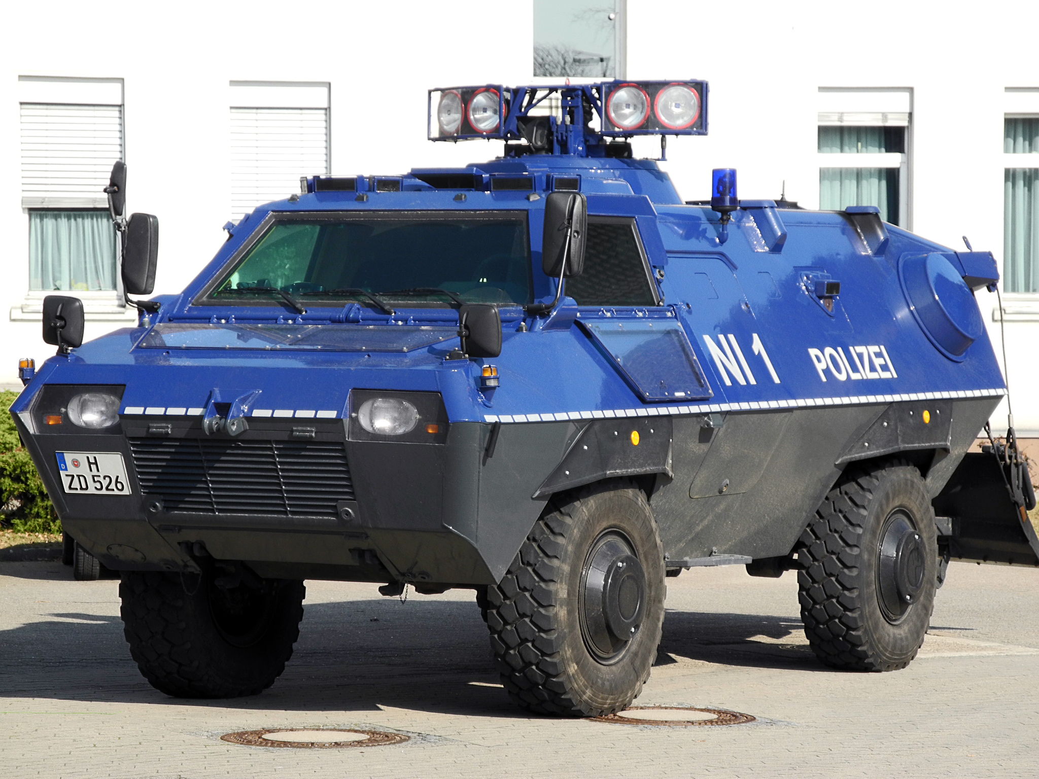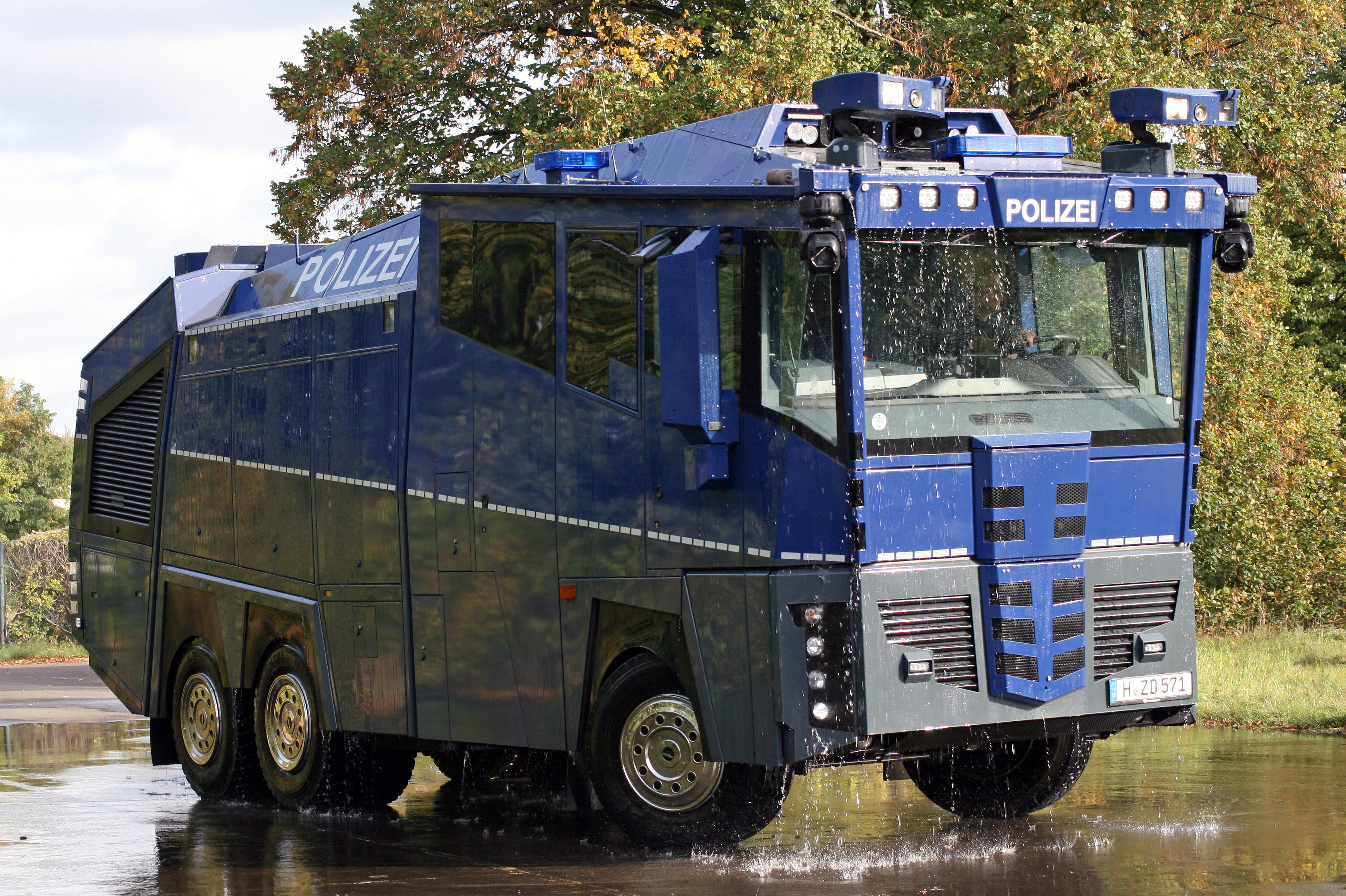 - Wasserwerfer: Das Spezialfahrzeug, das im Einzelfall über seine drei Werferarmaturen Wasser über eine Entfernung von bis zu 65m abgeben kann, fasst 10.000 Liter. Der Wasserstrahl kann außerdem aufgefächert werden, um die Verhältnismäßigkeit in jeder Situation zu wahren.