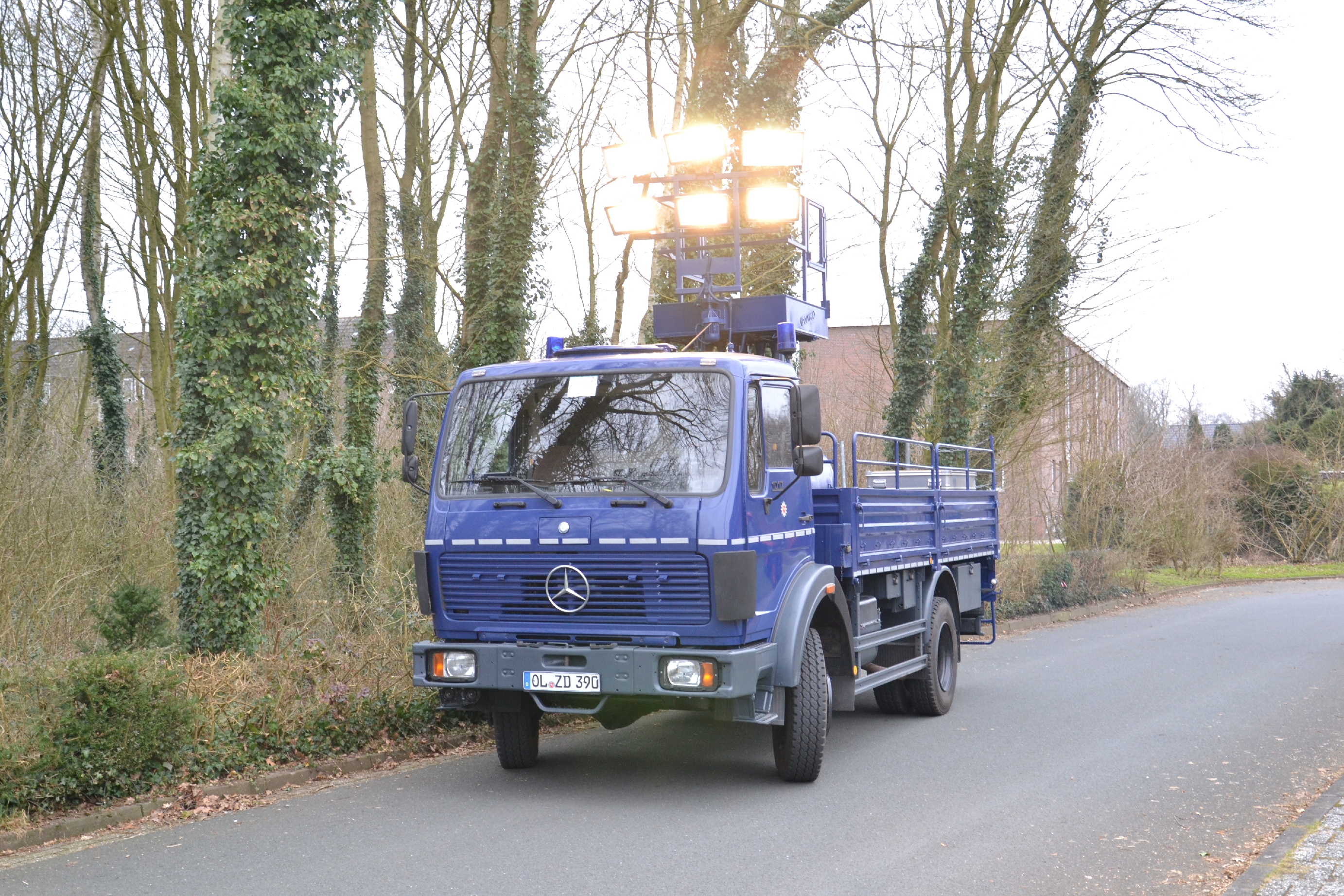 Lichtmastkraftwagen: Jeder Standort der TEE verfügt über einen Lichtmastkraftwagen mit dazugehörigem Lichtmastanhänger. Mit dem ausfahrbaren Mast mit Beleuchtungskörper kann eine Fläche von etwa 50 x 60 Metern ausgeleuchtet werden.